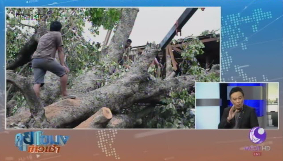 นางรวงทอง ขวัญศรี อายุ 43 ปี เจ้าของบ้าน เล่าว่า เกิดฝนตกลงมาอย่างหนัก ขณะนั้นกำลังนั่งรับประทานอาหารอยู่ในบ้าน และได้ยินเสียงต้นไม้ลั่น จึงเดินออกมาดูบริเวณหน้าบ้าน พบว่า ต้นหว้ายักษ์ที่อยู่ข้างบ้านค่อยๆ เอนลงมาทับหลังคาบ้าน ทำให้ได้รับความเสียหายทั้งหลัง จึงรีบแจ้งหน่วยงานที่เกี่ยวข้องให้รับทราบ เพื่อเข้าทำการช่วยเหลือ เบื้องต้นค่าเสียหายรวมประมาณ 100,000 บาท ขณะที่เจ้าหน้าที่ยังไม่สามารถตัดต้นหว้ายักษ์ออกไปได้ทั้งหมด เนื่องจากต้องใช้เครื่องมือหนักในการขนย้ายลงจากตัวบ้าน. – สำนักข่าวไทย
