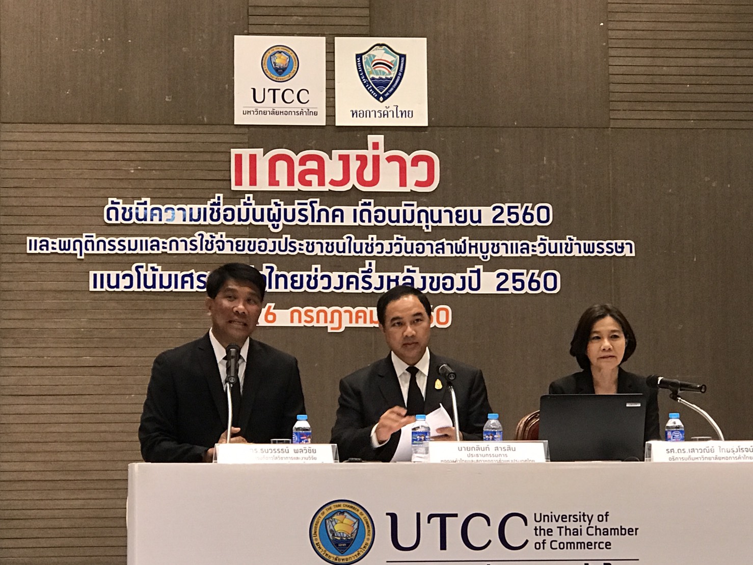 นางเสาวณีย์ ไทยรุ่งโรจน์ อธิการบดีมหาวิทยาลัยหอการค้าไทย แถลงผลสำรวจพฤติกรรมและการใช้จ่ายของประชาชนในช่วงวันอาสาฬหบูชาและวันเข้าพรรษา ปีนี้ว่า จากผลการสำรวจ 1,192 ตัวอย่าง ระหว่างวันที่ 28 มิ.ย.ถึง 2 ก.ค.60 พบว่า ประชาชนจะออกไปทำบุญไหว้พระเพิ่มขึ้นถึงร้อยละ 67.1 เมื่อเทียบกับช่วง 3-5 ปีที่ผ่านมา สำหรับจำนวนเงินที่ใช้ในการทำบุญก็เพิ่มขึ้น ถึงร้อยละ 60.6 โดยกทม.และปริมณฑลเพิ่มขึ้นร้อยละ 90.5 ต่างจังหวัดเพิ่มขึ้นร้อยละ 54.9 การใช้เงินเฉลี่ยคนละ 5,355.6 บาท แหล่งที่มาของเงินที่ใช้ในวันอาสาฬหบูบาและวันเข้าพรรษา ร้อยละ 55 ระบุว่า จากเงินเดือน ร้อยละ 31.7จากเงินออม และร้อยละ 11.7 ระบุว่า โบนัส รายได้พิเศษ ด้านปริมาณการซื้อของจำนวนชิ้นเพิ่มขึ้นร้อยละ 55 มูลค่าเพิ่มขึ้นร้อยละ 56.4 ประชาชนยังเห็นว่า ความคึกคักต่าง ๆ ของกิจกรรมในวันอาสาฬหบูชาและเข้าพรรษาปีนี้เมื่อเทียบกับปีที่แล้วจะคึกคักมากกว่า