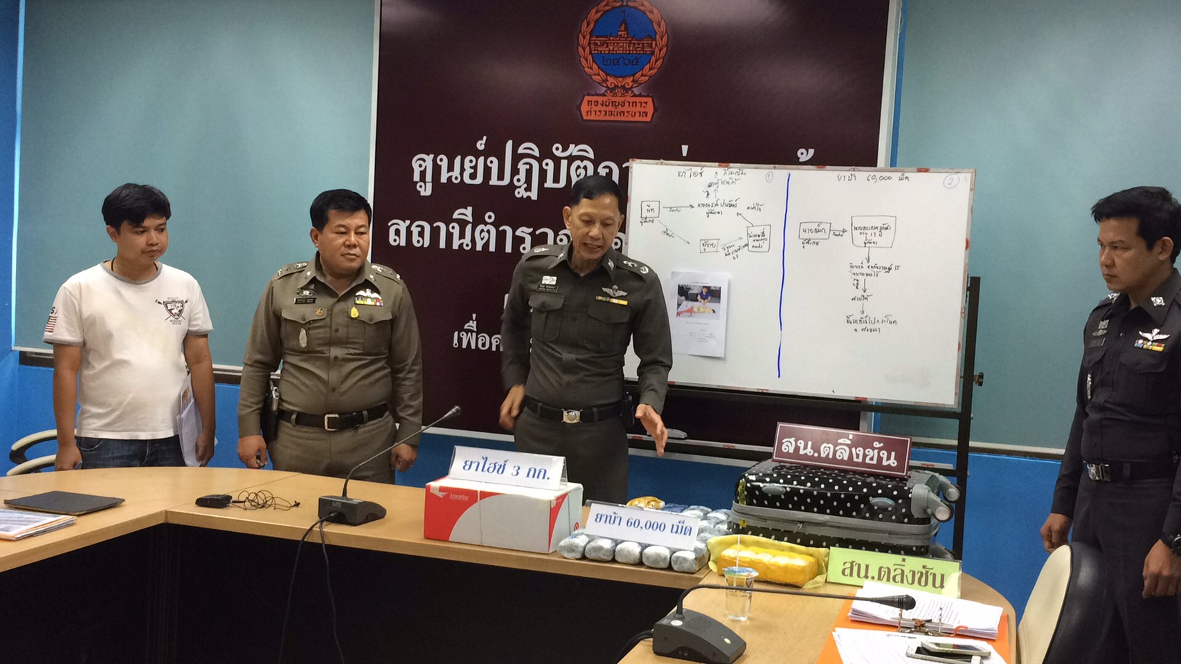 ตำรวจ สน.ตลิ่งชัน แถลงผลจับกุมเยาวชนอายุ 17 ปี พร้อมยาบ้า 6 หมื่นเม็ดที่บรรจุอยู่ในกระเป๋าเดินทาง ได้ที่บริเวณสถานีขนส่งสายใต้ใหม่ ขณะจะนำยาไปส่งที่อำเภอระโนด จังหวัดสงขลา โดยได้รับการว่าจ้างจากนายแม็ค ไม่ทราบชื่อและนามสกุล แลกกับค่าจ้าง 1 หมื่นบาท