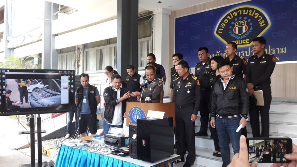 พลตำรวจตรีสุทิน ทรัพย์พ่วง ผู้บังคับการปราบปราม แถลงจับกุมผู้ต้องหาเครือข่ายรับผลิตสมุดคู่มือการจดทะเบียนรถ ป้ายแสดงการเสียภาษีและแผ่นป้ายทะเบียนปลอม หลังเจ้าหน้าที่เข้าปฏิบัติการตรวจค้น 12 จุด ในกรุงเทพฯและปริมณฑล อาทิ กรุงเทพฯ ฉะเชิงเทราพระนครศรีอยุธยา จับผู้ต้องหาได้ 5 คน จากหมายจับ 12 หมาย หลังผู้เสียหายเข้าร้องเรียนกับกองปราบและกรมการขนส่งทางบกว่า ได้รับใบสั่งอัตโนมัติแจ้งว่าทำผิดกฎจราจรในพื้นที่ต่างจังหวัดทั้งที่ไม่ได้เดินทางไปจุดดังกล่าว
