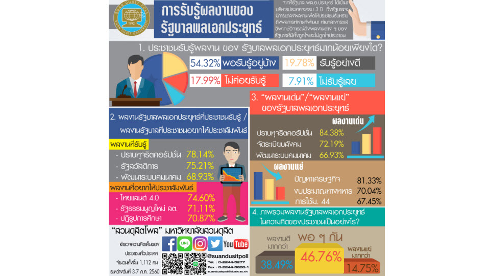 “สวนดุสิตโพล” สำรวจความคิดเห็นของประชาชนทั่วประเทศ จำนวน 1,112 คน ระหว่างวันที่ 3-7 กรกฎาคม 2560 ถึงการรับรู้ผลงานของรัฐบาล พล.อ.ประยุทธ์ จันทร์โอชา ก่อนที่รัฐบาลจะแถลงผลงานรอบ 3 ปี เพื่อให้ประชาชนรับทราบถึงผลการทำงานที่ผ่านมา พบว่า ร้อยละ54.32 พอรับรู้อยู่บ้าง เพราะมีข่าวทุกวัน ติดตามจากสื่อต่างๆ ฟังจากคนรอบข้าง ร้อยละ 19.78 รับรู้อย่างดี เพราะสนใจการเมือง ติดตามข่าวของรัฐบาลเป็นประจำ ดูจากรายการที่นายกฯ ออกมาพูดให้ฟังทุกสัปดาห์ ร้อยละ 17.99 ไม่ค่อยรับรู้ เพราะไม่ค่อยได้ติดตามข่าว สนใจข่าวอื่นมากกว่า และร้อยละ 7.91 ไม่รับรู้เลย เพราะไม่ชอบการเมือง ไม่สนใจ