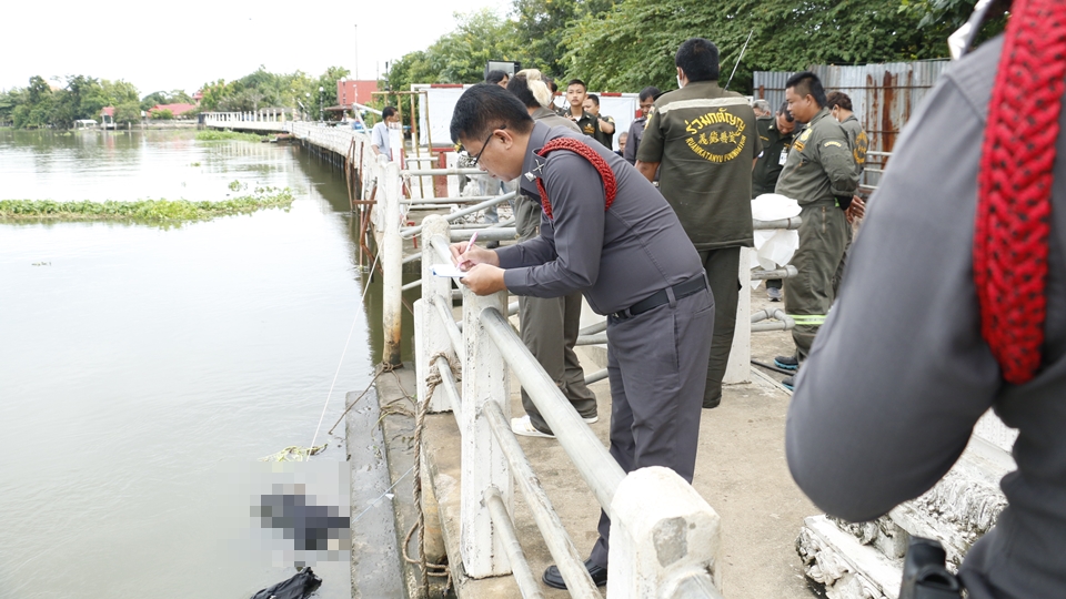 จากการสอบถามชาวบ้านผู้เห็นเหตุการณ์ทราบว่า ช่วงเช้าตรู่ที่ผ่านมา ขณะพายเรือหาปลาอยู่กลางแม่น้ำท่าจีน พบศพลอยอยู่กลางแม่น้ำ ตกใจมากไม่รู้จะทำอย่างไร จึงใช้เชือกผูกเอวลากเข้ามาผูกไว้กับท่าน้ำหน้าวัด ก่อนแจ้งตำรวจให้มาตรวจสอบ