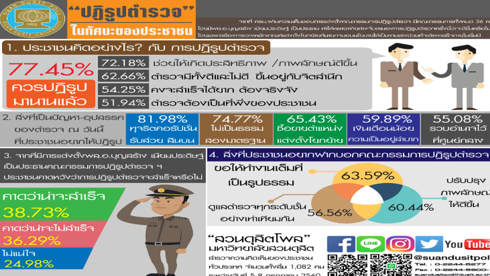 “สวนดุสิตโพล” สำรวจความคิดเห็นของประชาชนทั่วประเทศ จำนวน 1,082 คน ระหว่างวันที่ 5-8 กรกฎาคม 2560 เกี่ยวกับการปฏิรูปตำรวจ ว่า ประชาชนคิดอย่างไรกับการปฏิรูปตำรวจ พบว่า 3 อันดับแรก ได้แก่ ร้อยละ 77.45 เห็นควรปฏิรูปมานานแล้ว เป็นปัญหาที่สะสมมานาน ร้อยละ 72.18 เห็นว่าการปฏิรูปจะช่วยให้ทำงานอย่างมีประสิทธิภาพ และภาพลักษณ์ดีขึ้น และร้อยละ 62.66 เห็นว่า ตำรวจมีทั้งดีและไม่ดี ขึ้นอยู่กับจิตสำนึกแต่ละคน