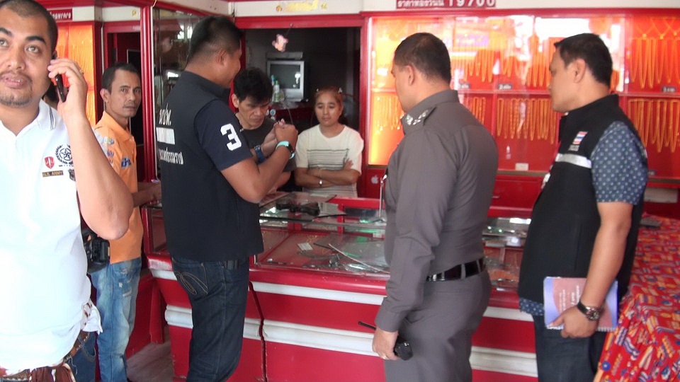 นายสุชาติ พวงศรีพงศ์ อายุ 53 ปี เจ้าของร้านให้การว่า เปิดร้านตามปกติเหมือนทุกวัน ขณะนั้นมีชาย 1 คน สวมหมวกไหมพรมและคลุมด้วยหมวกนิรภัยอีกชั้นเดินเข้ามาชักปืนลูกซองสั้นขู่บังคับไม่ให้ขัดขืนและใช้ขวานทุบกระจกตู้ใส่ทองรูปพรรณแตก พร้อมกวาดสร้อยคอทองคำ 5 เส้น น้ำหนักเส้นละ 2 สลึง รวมน้ำหนัก 2.50 บาท กำลังจะวิ่งหนีออกจากร้าน จึงใช้ปืนขนาด 9 มม. ยิงใส่ผู้ก่อเหตุไป 1 นัด คาดว่าได้รับบาดเจ็บ แต่ผู้ก่อเหตุได้ขับรถจักรยานยนต์หลบหนีไป