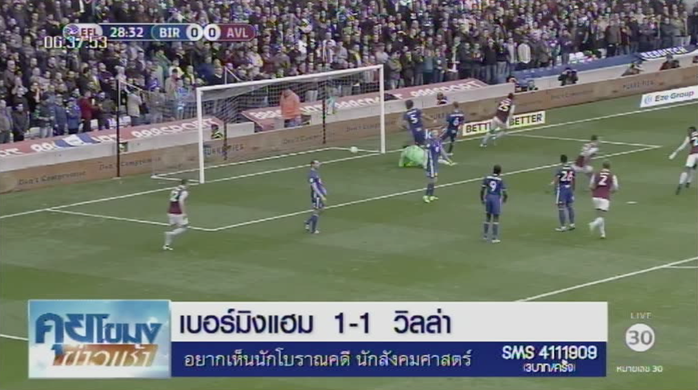 ฟุตบอลแชมเปียนชิพ อังกฤษ คู่ที่ช่อง 9 MCOT Family ช่อง 14 ถ่ายทอดสด เบอร์มิงแฮม ซิตี้ อันดับ 8 เปิดบ้านที่สนามเซนต์ แอนดรูว์ส สเตเดียม แอสตัน วิลล่า อันดับ 16 เกมนี้สิงห์ผงาดได้ประตูขึ้นนำก่อนนาทีที่ 29 จาก แกรี การ์ดเนอร์ จบครึ่งแรกวิลล่าบุกนำ 1-0 อย่างไรก็ตามครึ่งหลังเจ้าถิ่นมาไล่ตีเสมอได้สำเร็จจาก เดวิด เดวิส นาทีที่ 71 จบเกมเสมอกันไป 1-1 เบอร์มิงแฮม เตะ 15 นัด มี 24 คะแนนขึ้นมารั้งอันดับ 7 ส่วนวิลล่าเตะเท่ากันมี 18 คะแนนอยู่อันดับ 15. -สำนักข่าวไทย
