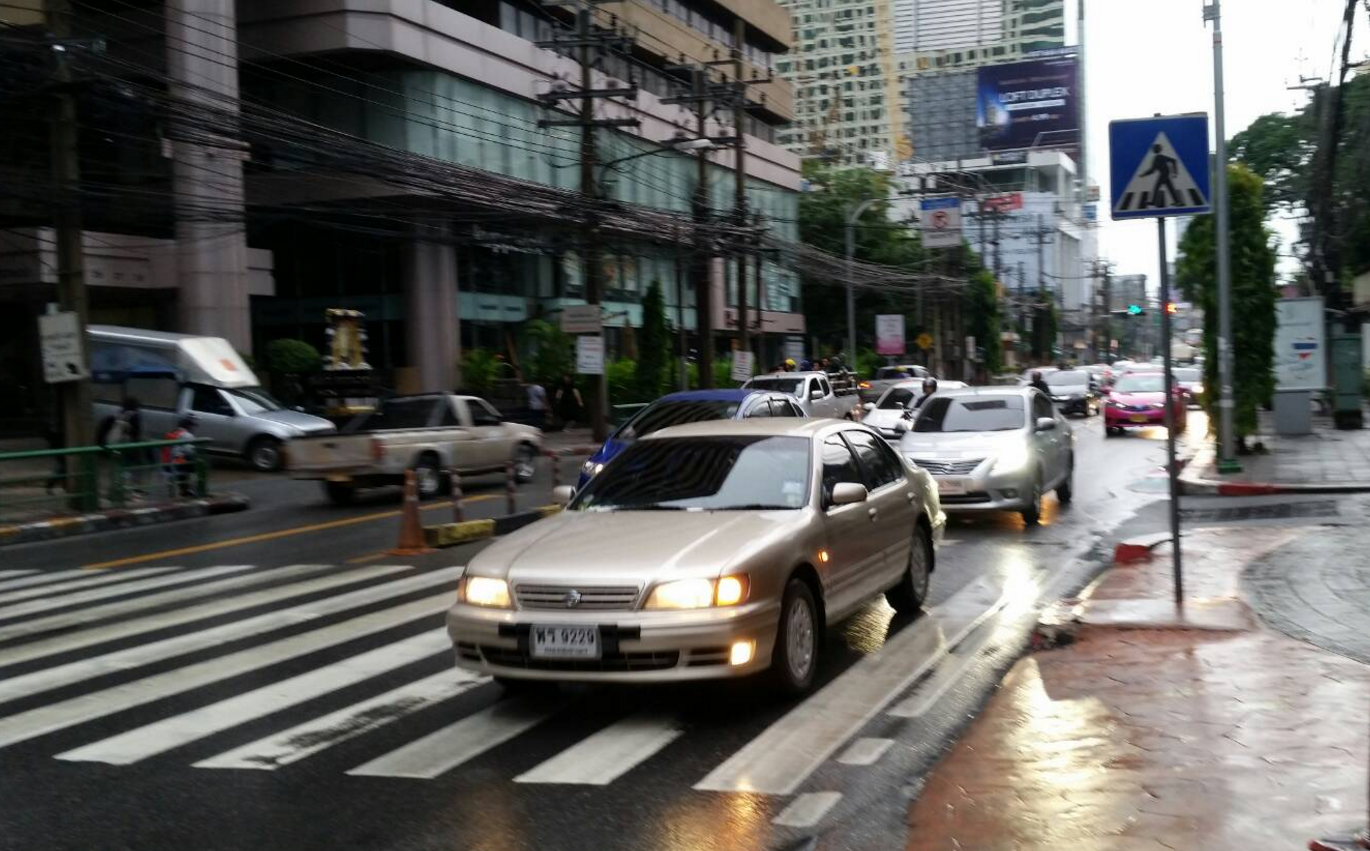 การจราจร แยกทองหล่อเหนือ ถนนเพชรบุรี ขาเข้า รถยังเคลื่อนตัวได้ฝนหยุดตก ถนนยังเปียกลื่น