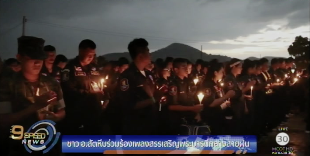 ชลบุรี 30 ต.ค.-ประชาชนในพื้นที่ อ.สัตหีบ จ.ชลบุรี ร่วมจุดเทียนและร้องเพลงสรรเสริญพระบารมี เพื่อแสดงความอาลัย ท่ามกลางสายฝนที่โปรยปราย