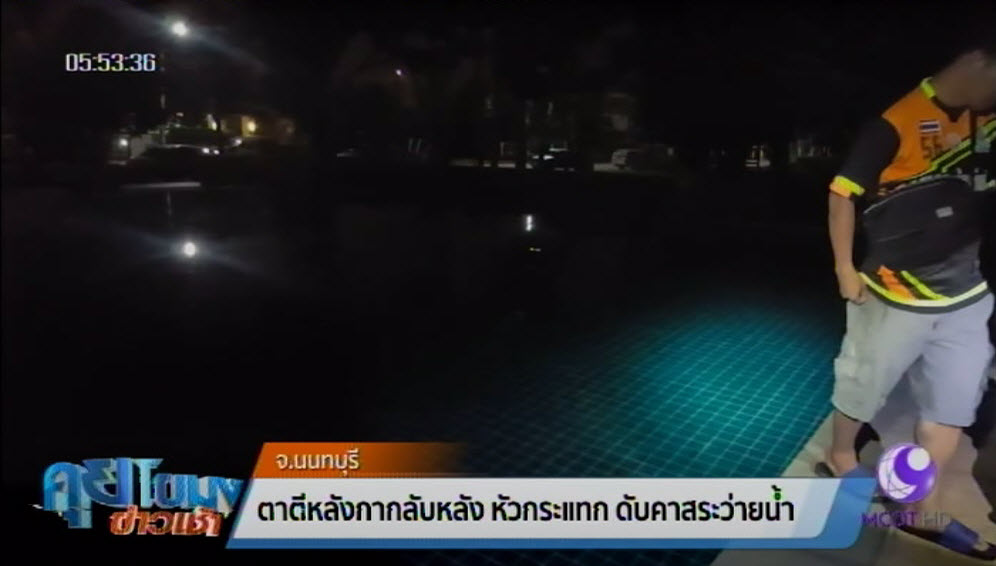 เมื่อเวลา 21.00 น. วันที่ 12 ก.ค.60 ร.ต.อ.เสถียร เสนผาบ ร้อยเวร สภ.คลองข่อย จ.นนทบุรี ได้รับแจ้งเหตุมีผู้จมน้ำเสียชีวิตที่สระว่ายน้ำสโมสรหมู่บ้านสราญสิริ หมู่ 2 ถนนราชพฤกษ์ ต.บางพลับ อ.ปากเกร็ด จ.นนทบุรี จึงประสานแพทย์จากสถาบันนิติวิทยาศาสตร์ และเจ้าหน้าที่อาสาสมัครมูลนิธิร่วมกตัญญู รุดตรวจสอบ