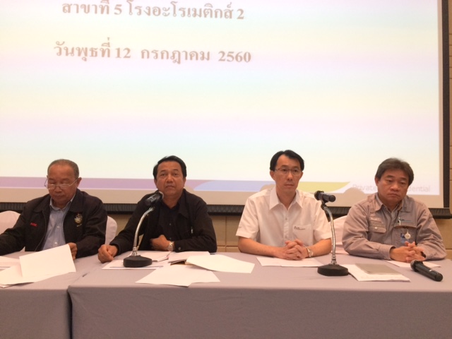 นายวิฑูรย์ อยู่ทิม รองผู้ว่าการการนิคมอุตสาหกรรมแห่งประเทศไทย (กนอ.) นายวีระศักดิ์ แจ้งการ ผู้อำนวยการสำนักงานนิคมอุตสาหกรรมร่วมกลุ่มมาบตาพุดดูแลนิคมอุตสาหกรรมอาร์ไอแอล อ.เมือง จ.ระยอง และนายพรรคพงษ์ วังรัตนโสภณ ผู้ช่วยกรรมการผู้จัดการใหญ่ กลุ่มผลิตภัณฑ์อะโรเมติกส์ บริษัท พีทีที โกลบอล เคมิคอล จำกัด (มหาชน) ร่วมแถลงที่ห้องประชุมนิคมอุตสาหกรรมอาร์ไอแอล กรณีสารเคมีรั่วไหลจากโรงงานอะโรเมติกส์ 2 เมื่อวานนี้ (12 ก.ค.) ว่า สาเหตุเกิดจากบริเวณช่องมองกระจกแตกระหว่างการระบายของเหลวจากหอกลั่นไปยังถังพักใต้ดิน ซึ่งเป็นระบบปิดและเป็นกระบวนการตรวจสอบการไหลของเหลวภายในโรงงานอะโรเมติกส์ อย่างไรก็ตาม ทีมระงับเหตุได้เข้าดำเนินการอย่างเร่งด่วนปิดวาล์วท่อส่งสารไซลีน เพื่อหยุดการรั่วไหลและควบคุมไม่ให้สารแพร่กระจายออกนอกโรงงาน โดยใช้น้ำดับเพลิงฉีดเป็นละอองฝอยไม่ให้แพร่กระจายไปในอากาศและสามารถควบคุมสถานการณ์ได้ในเวลาต่อมา ส่วนค่าเสียหายอยู่ระหว่างตรวจสอบ เบื้องต้นโรงงานยังเปิดเดินเครื่องตามปกติ แต่สั่งหยุดไซด์งานที่เกิดเหตุไว้ก่อน พร้อมส่งเจ้าหน้าที่เข้าตรวจสอบจุดอื่น ๆ เพื่อความมั่นใจและป้องกันปัญหาเกิดขึ้นอีก