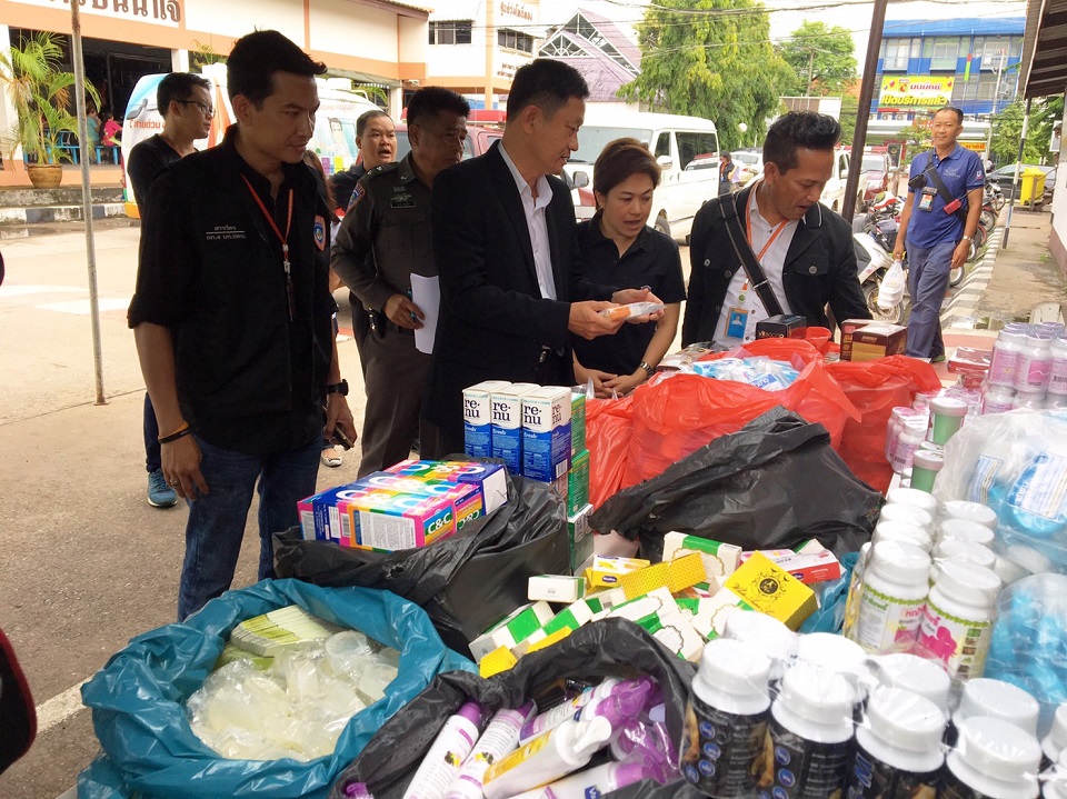 นพ.สมิต ประสันนาการ นายแพทย์สาธารณสุขจังหวัดอุดรธานี พ.ต.ต.สุรเชษฐ์ เดชะพันธ์ สว.กก.4 กองบังคับการปราบปรามการกระทำความผิดเกี่ยวกับการคุ้มครองผู้บริโภค (บก.ปคบ.) ร่วมกับเจ้าหน้าที่สำนักงานอาหารและยา (อย.) กระทรวงสาธารณสุข ตรวจจับกุมร้านบิวตี้ 4 แห่ง ย่านตลาดขายส่งรายใหญ่ ถนนรอบเมือง เขตเทศบาลตำบลหนองบัว อ.เมือง ซึ่งจำหน่ายเครื่องสำอาง ยา และอาหารเสริมที่มีสารต้องห้าม สารสเตียรอยด์ ปรอท และไม่มี อย.