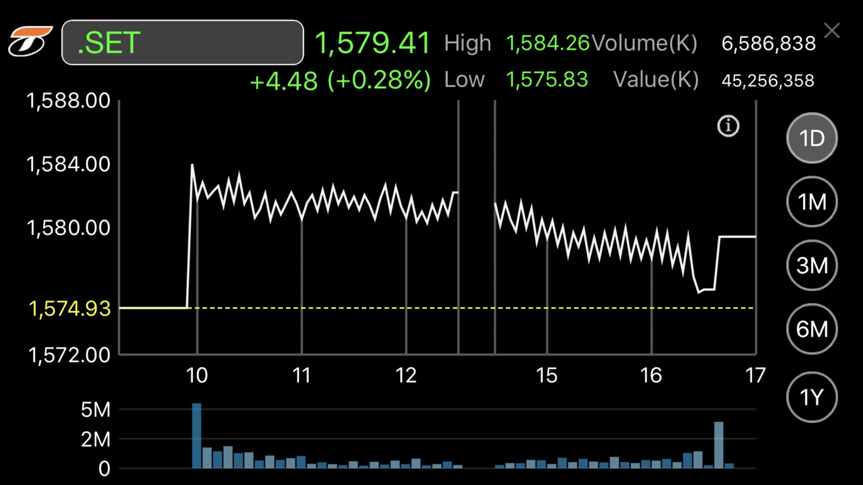 ผู้สื่อข่าวรายงานว่าดัชนีตลาดหลักทรัพย์ฯ ปิดที่ระดับ 1,579.41 จุด เพิ่มขึ้น 4.48 จุด หรือร้อยละ 0.28 มูลค่าการซื้อขาย 45,256.36 ล้านบาท การซื้อขายวันนี้ (13 ก.ค.) ดัชนีเคลื่อนไหวแดนบวกตลอดทั้งวัน โดยดัชนีฯ แตะจุดสูงสุดที่ 1,584.26 จุด และต่ำสุดที่ระดับ 1,575.83 จุด