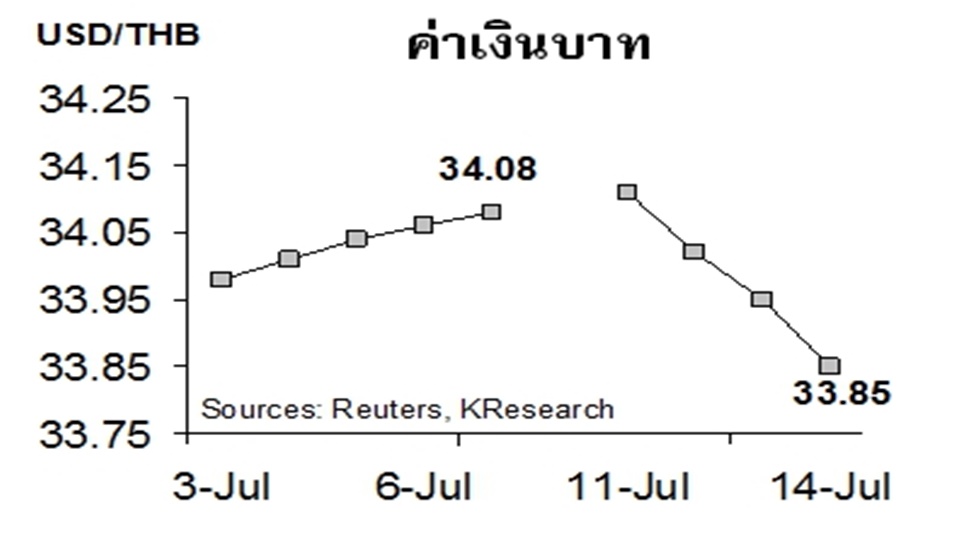 บริษัท ศูนย์วิจัยกสิกรไทย จำกัด รายงานว่าสัปดาห์ที่ผ่านมา (11-14 ก.ค.) เงินบาทพลิกกลับมาแข็งค่า โดยเงินบาทแตะระดับแข็งค่าสุดในรอบ 1 เดือนสอดคล้องกับทิศทางเงินเยนที่ขยับแข็งค่าขึ้นในช่วงปลายสัปดาห์ ขณะที่เงินดอลลาร์ฯ ก็เผชิญแรงเทขาย หลังคำแถลงต่อสภาคองเกรสของประธานกลางสหรัฐ (เฟด) ไม่ได้ส่งสัญญาณเชิงคุมเข้มมากนัก โดยระบุเพียงว่าเฟดจะทยอยปรับขึ้นดอกเบี้ยและปรับลดงบดุลอย่างค่อยเป็นค่อยไป นอกจากนี้ เงินบาทยังได้รับแรงหนุนจากปัจจัยทางเทคนิคช่วงปลายสัปดาห์ด้วยเช่นกัน ทั้งนี้ เป็นที่น่าสังเกตว่าเงินบาทปรับตัวแข็งค่าขึ้น แม้ว่านักลงทุนต่างชาติจะมีสถานะขายสุทธิในตลาดพันธบัตรไทยตลอดทั้งสัปดาห์ก็ตาม โดยวันศุกร์ที่ 14 กรกฎาคม เงินบาทอยู่ที่ 33.85 บาทต่อดอลลาร์สหรัฐ เทียบกับ 34.08 บาทต่อดอลลาร์สหรัฐ ในวันศุกร์ก่อนหน้า