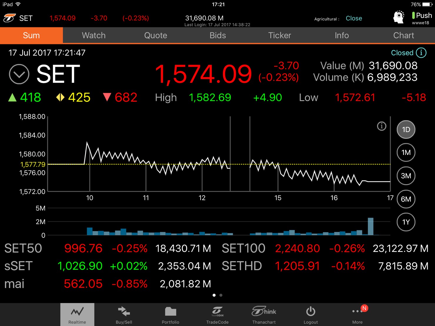 ผู้สื่อข่าวรายงานว่าดัชนีตลาดหลักทรัพย์ปิดที่ระดับ 1,574.09 จุด ลดลง 3.70 จุด หรือร้อยละ 0.23 มูลค่าการซื้อขาย 31,690.08 ล้านบาท การซื้อขายวันนี้ดัชนีเคลื่อนไหวแดนลบเป็นส่วนใหญ่ แตะจุดสูงสุดที่ระดับ 1,582.69 จุด และต่ำสุดที่ระดับ 1,572.61 จุด