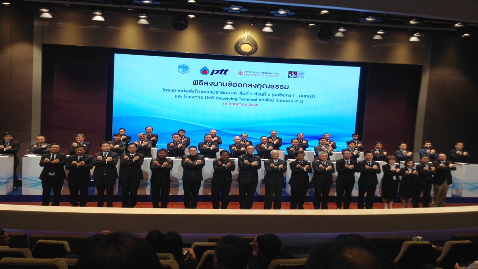 สำหรับการลงนามข้อตกลงคุณธรรมโครงการท่อส่งก๊าซธรรมชาติบนบกเส้นที่ 5 ส่วนที่ 2 จากจังหวัดฉะเชิงเทราถึงนนทบุรี เป็นการลงนามระหว่าง ปตท.กับผู้จะซื้อเอกสารประมูลราคาล่วงหน้า 8 ราย เพื่อเพิ่มกำลังการส่งก๊าซธรรมชาติจากฝั่งตะวันออกไปยังโครงข่ายระบบท่อส่งก๊าซธรรมชาติฝั่งตะวันตก อีกทั้งเป็นการเพิ่มความมั่นคงในการจัดส่งก๊าซธรรมชาติให้กับโรงไฟฟ้าบางปะกง โรงไฟฟ้าวังน้อย โรงไฟฟ้าพระนครเหนือและโรงไฟฟ้าพระนครใต้ มีกำหนดเสร็จปี 2564 งบประมาณลงทุนทั้งสิ้น 96,500 ล้านบาท