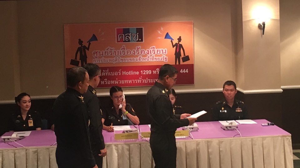 พล.อ.เฉลิมชัย สิทธิสาท ผู้บัญชาการทหารบก ตรวจศูนย์รับเรื่องร้องเรียนกองทัพบก ที่ถือเป็นศูนย์ส่วนกลาง ตามคำสั่งของหัวหน้าคณะรักษาความสงบแห่งชาติ (คสช.) จากทั้งหมด 74 ศูนย์ทั่วประเทศ ตั้งแต่วันที่ 14 กรกฎาคม เป็นต้นมา เพื่อแก้ไขปัญหาการทุจริตของเจ้าหน้าที่รัฐให้เป็นรูปธรรม โดยภาพรวมถือว่าน่าพอใจ พบมีเรื่องร้องเรียนทั้งหมด 417 เรื่อง ทั้งทางโทรศัพท์ และส่งเอกสาร 12 เรื่อง มีเรื่องการทุจริตเจ้าหน้าที่รัฐ 53 เรื่อง ส่วนใหญ่เป็นการทุจริตในหน้าที่ แต่หากเป็นเรื่องความเดือดร้อนของประชาชน จะส่งเรื่องให้กับสำนักปลัดสำนักนายกรัฐมนตรี (สปน.) ดำเนินการแก้ไขทันที แต่หากเป็นเรื่องที่กองทัพบกสามารถช่วยเหลือได้ จะดำเนินการทันที เพื่อความน่าเชื่อถือจะมีการตั้งคณะกรรมการตรวจสอบ โดยมีตัวแทนของกองทัพบก และเลขาธิการศูนย์อำนวยการต่อต้านการทุจริตแห่งชาติ(ศอตช.)