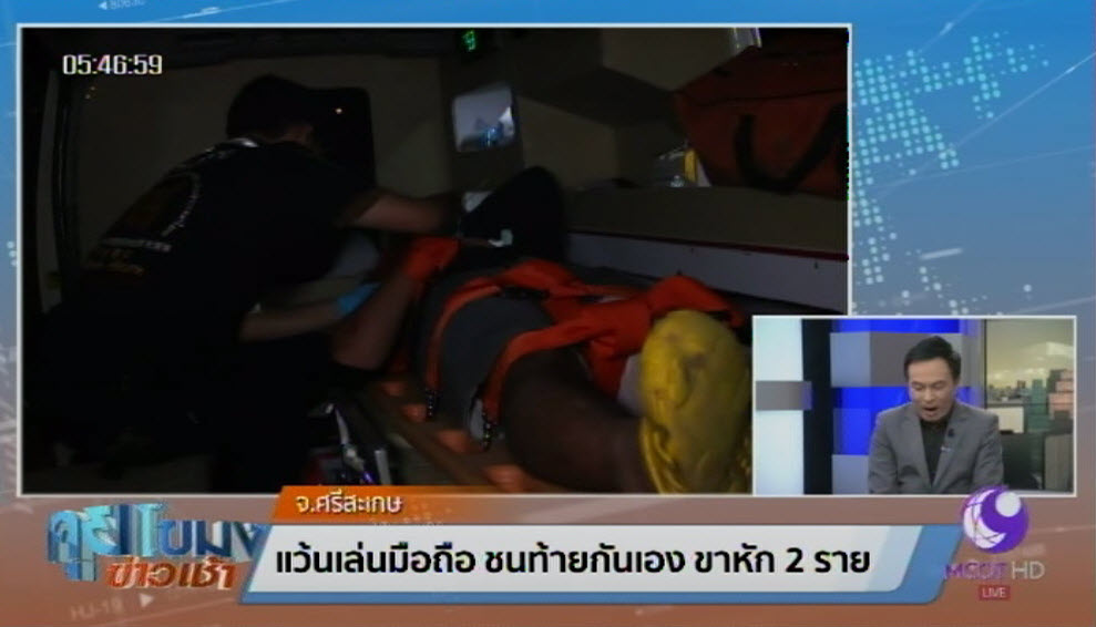 ศรีสะเกษ 21 ก.ค.-เด็กแว้นศรีสะเกษเล่นโทรศัพท์มือถือ ไม่มองทาง ชนท้ายรถเพื่อนที่ขับตามกันมาเสียหลักลงข้างทาง บาดเจ็บขาหัก 2 คน