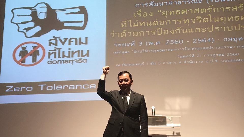 ป.ป.ช. 21 ก.ค.-ประธาน ป.ป.ช.เปิดเวทีสัมมนาสาธารณะรับฟังความคิดเห็นการสร้างสังคมที่ไม่ทนต่อการทุจริต หลักสูตรนักบริหารยุทธศาสตร์การป้องกันและปราบปรามการทุจริตระดับสูง ระบุต้องใช้ความร่วมมือทุกภาคส่วนจัดทำยุทธศาสตร์ป้องกันการทุจริต