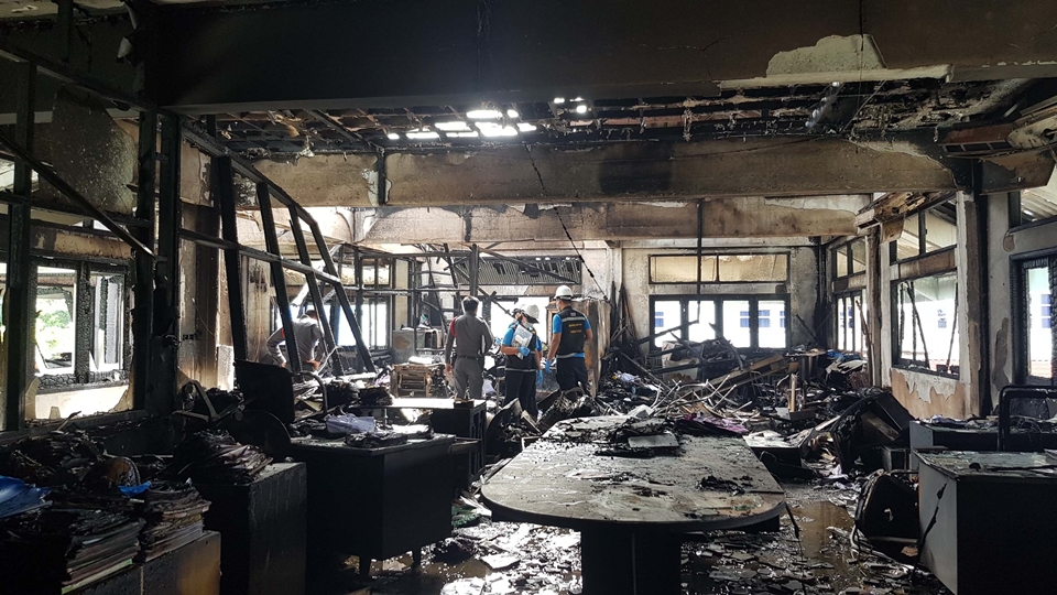 ส่วนสภาพภายในห้องที่เกิดเหตุ พบว่าอุปกรณ์การทำงานต่างๆ ถูกไฟไหม้เสียหายทั้งหมด เช่น เครื่องคอมพิวเตอร์ที่เก็บข้อมูลงานสาธารณสุข จำนวน 12 เครื่อง เครื่องโปรเจคเตอร์ 1 เครื่อง เครื่องถ่ายเอกสาร 2 เครื่อง แอร์ติดผนังห้อง 5 เครื่อง ตู้เย็น 1 ตู้ โต๊ะทำงาน รวมทั้งเอกสารราชการจำนวนมากถูกไฟไหม้และเปียกน้ำจนเสียหายแทบทั้งหมด และขณะที่นายอำเภอกำลังตรวจสอบที่เกิดเหตุอยู่นั้น ก็พบว่ายังมีบางจุดที่มีควันไฟลอยขึ้นมา จึงต้องให้เจ้าหน้าที่ดับเพลิงนำน้ำมาฉีด เพื่อป้องกันไฟปะทุขึ้นมาอีก ขณะที่เจ้าหน้าที่พิสูจน์หลักฐานเข้าตรวจสอบตามจุดต่างๆ โดยเฉพาะจุดที่มีสายไฟ ที่คาดว่าอาจจะเป็นต้นเหตุที่ทำให้เกิดไฟฟ้าลัดวงจรได้