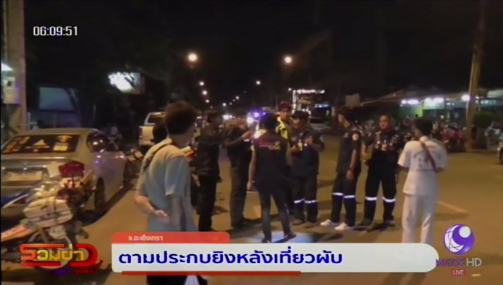 จากการสอบถามนายพิชัย ประมาณ รปภ.ของบริษัท แอ๊กการ์ด ซึ่งเป็นเพื่อนของผู้ที่ได้รับบาดเจ็บสาหัสให้การว่า ไปเที่ยวที่ผับแห่งหนึ่งบนถนนศรีโสธรตัดใหม่ เมื่อผับเลิกจึงขี่รถจักรยานยนต์มุ่งหน้ากลับบ้าน ระหว่างนั้นมีรถจักยานยนต์อีกคันซ้อน 2 ขี่ตามประกบ ก่อนที่คนซ้อนท้ายจะใช้อาวุธปืนไม่ทราบขนาดยิงใส่เพื่อนของตนเอง 2 นัด จนตกจากรถ คนร้ายขี่รถวนกลับมาดูก่อนหลบหนีไป ส่วนผู้บาดเจ็บสาหัส แพทย์เร่งช่วยเหลือ ด้านตำรวจภูธรเมืองฉะเชิงเทราจะเร่งสอบสวนต่อไป. – สำนักข่าวไทย