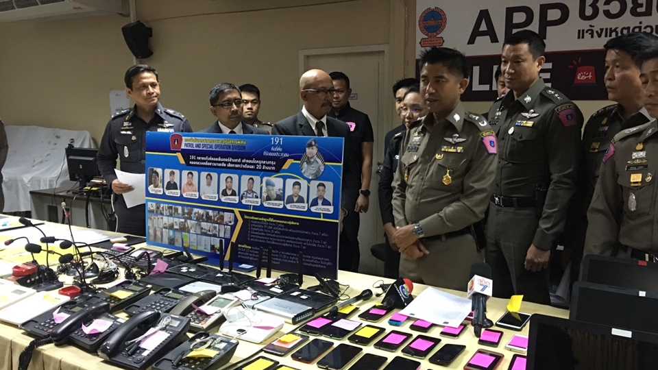 พล.ต.ต.สุรเชษฐ์ หักพาล ผู้บังคับการสายตรวจและปฏิบัติการพิเศษ (191) พร้อมตัวแทนสถานทูตมาเลเซีย แถลงจับกุมแก๊งคอลเซ็นเตอร์ชาวไต้หวันและมาเลเซีย รวม 9 คน หลังเช่าคอนโดฯ หรูในซอยสุขุมวิท 8 เป็นฐานปฏิบัติการ หลอกชาวมาเลเซียในไทยให้โอนเงิน โดยใช้อุบายหลอกเรื่องภาษี หรือตกเป็นผู้ต้องหาคดีอาชญากรรม อันเป็นความผิดในลักษณะฉ้อโกงประชาชน โดยโทรศัพท์แจ้งข้อความอันเป็นเท็จ ในลักษณะอาชญากรรมข้ามชาติ รูปแบบแก๊งคอลเซ็นเตอร์ พร้อมยึดคอมพิวเตอร์โน้ตบุ๊ก 7 เครื่อง โทรศัพท์บ้านบันทึกขั้นตอนวิธีการหลอกลวง ลำโพงบันทึกเสียงสร้างบรรยากาศคล้ายสถานที่ราชการ เราเตอร์ชนิดใส่ซิมการ์ด พร้อมอุปกรณ์ต่อพ่วง 7 เครื่อง เอกสารข้อมูลธนาคาร หน่วยงานราชการ และบทสนทนาสำหรับใช้หลอกลวงผู้เสียหาย