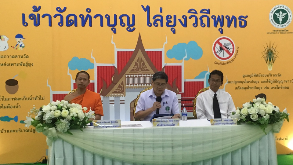 นพ.เจษฎา โชคดำรงสุข อธิบดีกรมควบคุมโรค พร้อมด้วยพระมหาสมควร สุทสฺสโน ผู้ช่วยเจ้าอาวาสวัดบัวขวัญ เปิดโครงการรณรงค์ “เข้าวัดทำบุญ ไล่ยุงวิถีพุทธ” ชวนพุทธศาสนิกชนสร้างบุญป้องกันโรคติดต่อจากยุงลายด้วย 5 วิธี หลังพบว่าศาสนสถานเป็นแหล่งที่พบลูกน้ำยุงลายมากที่สุด ถึงร้อยละ 58