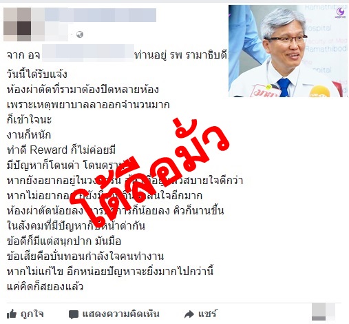 สำนักข่าวไทย 26 ก.ค. – ผอ.รพ.รามาธิบดี ยืนยัน ไม่มีพยาบาลลาออกมากจนต้องปิดห้องผ่าตัดบางห้อง ตามที่เกิดกระแสข่าวลือในโลกโซเชียล
