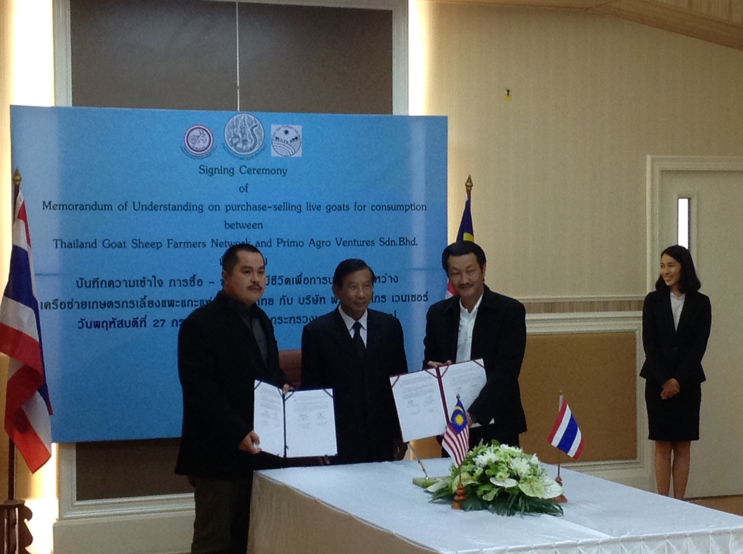 พลเอกฉัตรชัย สาริกัลยะ รัฐมนตรีว่าการกระทรวงเกษตรและสหกรณ์ เป็นประธานในพิธีลงนามระหว่างเครือข่ายเกษตรกรเลี้ยงแพะแกะแห่งประเทศไทยกับ บริษัท พรีโม อะโกร เวนเชอร์ ประเทศมาเลเซีย พร้อมทั้ง กล่าวว่า การซื้อขายดังกล่าวจะมีผลทันทีโดยมีกำหนดระยะเวลา 1 ปีและสามารถต่ออายุไปได้อีกหากทั้งสองฝ่ายตกลงร่วมกันไม่น้อยกว่า 60 วันก่อนที่ระยะเวลาจะสิ้นสุดลง