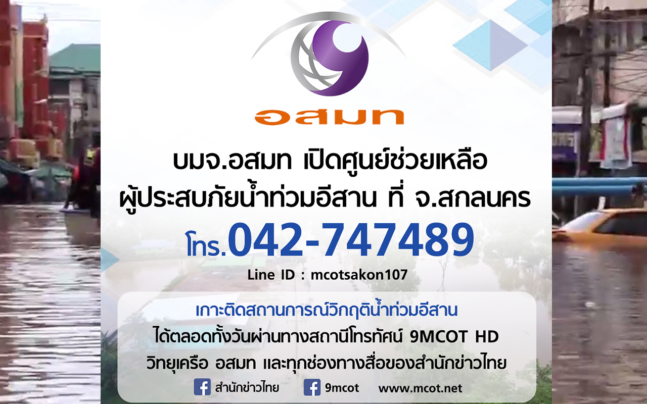 อสมท 29 ก.ค.60 – บมจ.อสมท เปิด ศูนย์ช่วยเหลือผู้ประสบภัยน้ำท่วมอีสานที่ จ.สกลนคร สามารถขอความช่วยเหลือและแจ้งเหตุที่ได้สถานีวิทยุ อสมท สกลนคร Fm 107 MHz โทร. 042-747489 หรือ Line ID : mcotsakon107