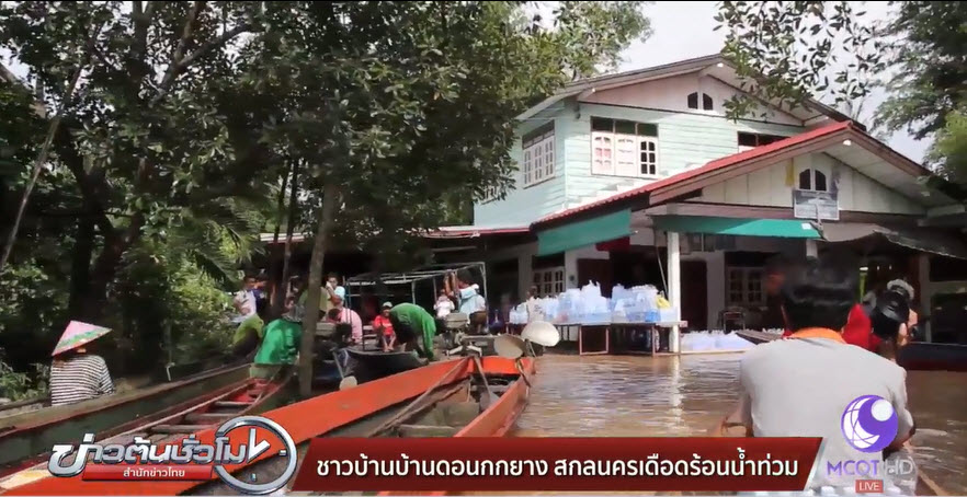 สถานการณ์ที่ตัวเมืองสกลนครยังไม่คลี่คลาย ชาวบ้านบ้านดอนยาง ตำบลเหล่าปอแดง อำเภอเมืองสกลนคร จำนวน 86 หลังคาเรือน 364 ชีวิตต้องติดเกาะอยู่ในหมู่บ้าน หากจะเดินทางเข้าออกต้องใช้เรือเป็นระยะทางกว่า 3 กิโลเมตร และต้องอพยพสัตว์เลี้ยงไปไว้ที่สูง ผู้ใหญ่บ้านดอนยาง ระบุสิ่งที่ชาวบ้านต้องการขณะนี้ คือ ให้เจ้าหน้าที่ช่วยส่งอาหารแห้ง น้ำดื่ม เครื่องปั่นไฟ และเรือท้องแบนอำนวยความสะดวก