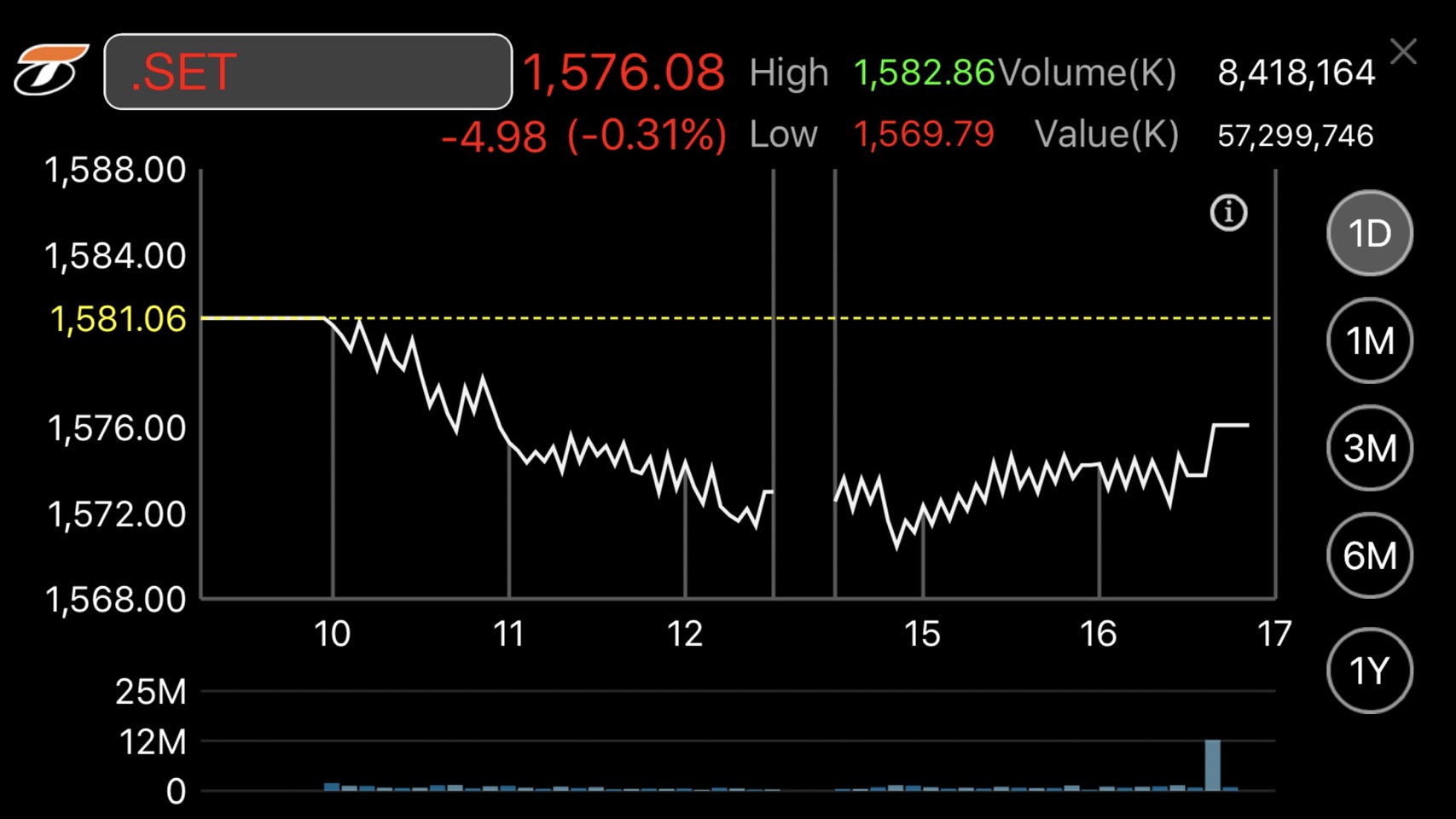 ผู้สื่อข่าวรายงานว่าตลาดหลักทรัพย์ปิดการซื้อขายวันนี้ที่ระดับ 1,576.08 จุด ลดลง 4.98 จุด หรือ ร้อยละ 0.31 มูลค่าการซื้อขาย 57,299.81 ล้านบาท โดยดัชนีเคลื่อนไหวแดนลบเป็นหลัก ดัชนีสูงสุดของวันที่ระดับ 1,582.86 จุด และต่ำสุดที่ระดับ 1,569.79 จุด มีแรงขายช่วงบ่ายในหุ้นขนาดใหญ่ ขณะที่หุ้นต่างประเทศปิดตลาดทั้งแดนบวกและลบ