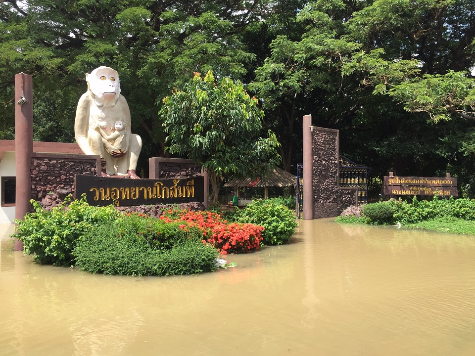 สถานการณ์แม่น้ำชีใน จ.มหาสารคาม เอ่อท่วมวนอุทยานโกสัมพี อ.โกสุมพิสัย เต็มพื้นที่ 125 ไร่ ระดับน้ำสูง 1 เมตร จุดต่ำสุดลึกถึง 3 เมตร และส่งผลกระทบต่อฝูงลิงแสม มีทั้งขนสีเทาและสีทอง อาศัยอยู่ตามธรรมชาติกว่า 800 ตัว ต้องอพยพไปอยู่บริเวณรอบถนนทางเข้าวนอุทยานฯ รวมถึงกำแพงศาลเจ้า ซึ่งปกติลิงแสมเหล่านี้จะอาศัยอยู่ตามต้นไม้ใหญ่ กินผลไม้ป่า เช่น ต้นกระเบา เมื่อเกิดภาวะน้ำท่วมครั้งนี้ เจ้าหน้าที่จำเป็นต้องนำอาหารมาให้ลิงเป็นการชั่วคราว