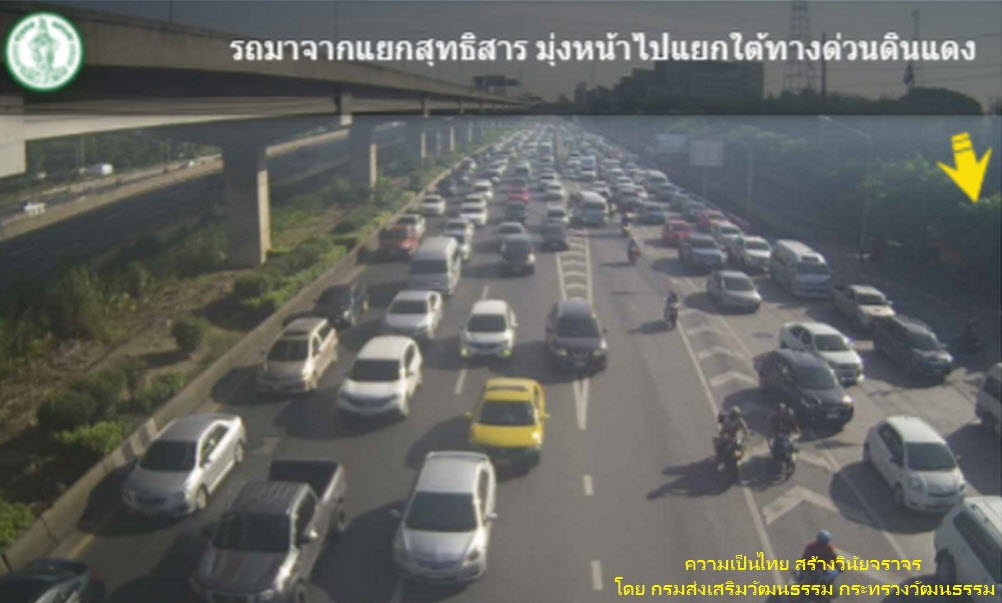 ถนนวิภาวดี-รังสิต ขาเข้า จากแยกสุทธิสาร มุ่งหน้าใต้ด่วนดินแดง ทั้งช่องทางด่วนและคู่ขนาน หนาแน่น รถเคลื่อนตัวได้ช้า