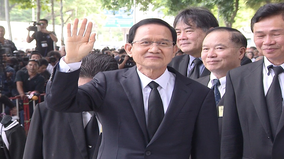 นายสมชาย วงศสัวสดิ์ อดีตนายกรัฐมนตรี เดินทักทายผู้ที่มาให้กำลังใจและสื่อมวลชน ซึ่งมีอดีตส.ส. อดีตรัฐมนตรีในขณะนั้นมาให้กำลังใจนายสมชายและพวก