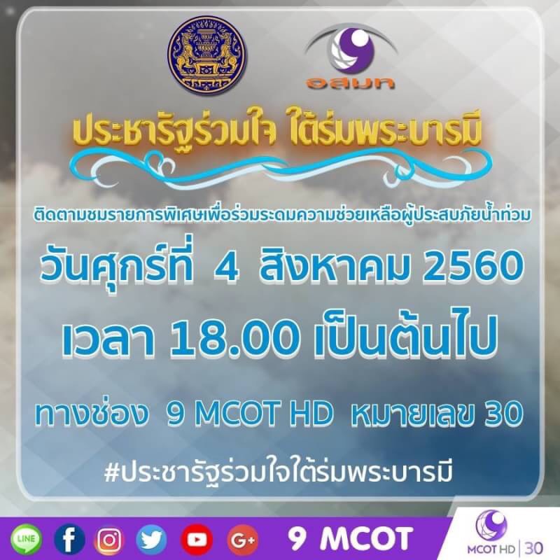 สำนักนายกรัฐมนตรี ร่วมกับ บริษัท อสมท จำกัด (มหาชน) เตรียมจัดงาน “ประชารัฐร่วมใจ ใต้ร่มพระบารมี” ในวันศุกร์ที่ 4 ส.ค.60 นี้ เวลา 18.00–19.30 น. ณ ตึกสันติไมตรี ทำเนียบรัฐบาล โดยมี พล.อ.ประยุทธ์ จันทร์โอชา นายกรัฐมนตรี เป็นประธานในงาน เพื่อเชิญชวนหน่วยงานภาครัฐ ภาคเอกชน และประชาชนจากทุกภาคส่วนที่มีความประสงค์จะช่วยเหลือผู้ประสบภัย น้ำท่วมภาคเหนือและภาคตะวันออกเฉียงเหนือ ร่วมบริจาคเงินเข้ากองทุนเงินช่วยเหลือผู้ประสบสาธารณภัยสำนักนายกรัฐมนตรี โดยโอนเงินเข้าบัญชีธนาคารกรุงไทย จำกัด (มหาชน) สาขาทำเนียบรัฐบาล เลขที่บัญชี 067-0-06895-0 ซึ่งธนาคารกรุงไทยได้เตรียมความพร้อมในการรองรับการโอนเงินผ่านทุกช่องทางของธนาคาร