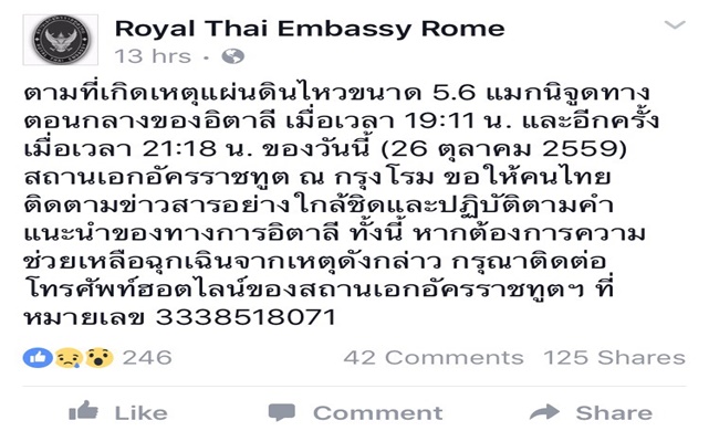 เฟซบุ๊คสถานเอคอัครราชทูตไทย ณ กรุงโรม ประเทศอิตาลี โพสต์ข้อความระบุว่า ตามที่เกิดเหตุแผ่นดินไหวขนาด 5.6 แมกนิจูดทางตอนกลางของอิตาลี เมื่อเวลา 19:11 น. และอีกครั้งเมื่อเวลา 21:18 น. ของวันที่26 ตุลาคมที่ผ่านมา สถานเอกอัครราชทูต ณ กรุงโรม ขอให้คนไทยติดตามข่าวสารอย่างใกล้ชิดและปฏิบัติตามคำแนะนำของทางการอิตาลี