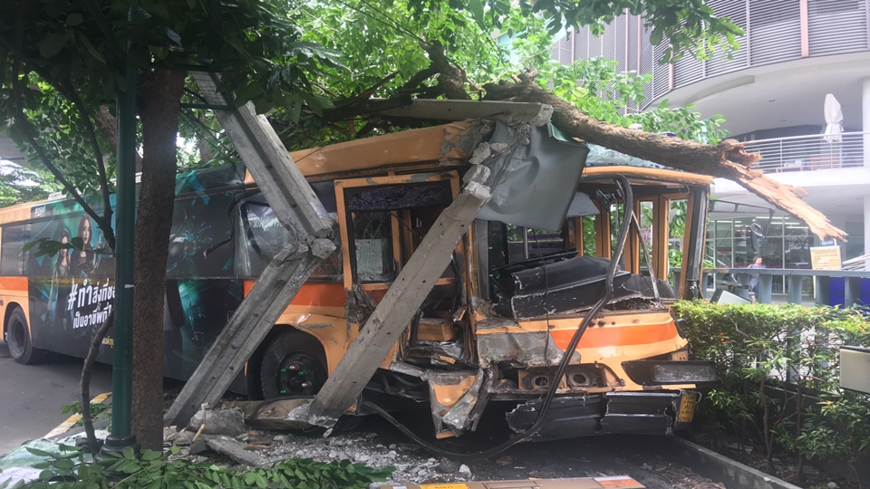 กรุงเทพฯ 5 ส.ค.- รถเมล์ปรับอากาศรับ-ส่งผู้โดยสาร MRT เสียหลักพุ่งชนตอม่อรถไฟฟ้า BTS เสาไฟ และรั้วคอนโดฯ ย่านสะพานควาย พังเสียหาย คนขับบาดเจ็บ