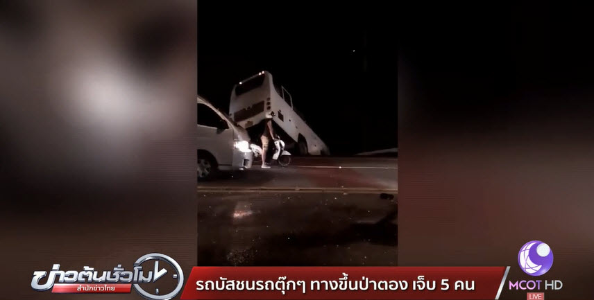 ภูเก็ต 6 ส.ค.-รถบัสนักท่องเที่ยวจีน ชนกับรถตุ๊กตุ๊ก ก่อนเสียหลักพุ่งชนรถตู้โดยสารอีก 3 คัน รถจักรยานยนต์ และพุ่งชนไหล่ทางเขาป่าตอง อ.กะทู้ จ.ภูเก็ต เจ็บ 5 คนขับรถบัส สาหัส