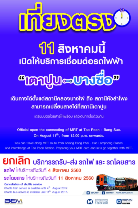 บริษัท ทางด่วนและรถไฟฟ้ากรุงเทพ จำกัด (มหาชน) หรือ BEM ร่วมกับการรถไฟฟ้าขนส่งมวลชนแห่งประเทศไทย (รฟม.) แจ้งกำหนดการเปิดให้บริการโครงการรถไฟฟ้าสายสีน้ำเงินส่วนต่อขยายเตาปูน – บางซื่อ ผู้โดยสารสามารถเดินทางในระบบรถไฟฟ้าข้ามสายได้ โดยสามารถเปลี่ยนขบวนรถไฟฟ้าได้ที่สถานีเตาปูน ตั้งแต่วันที่ 11 สิงหาคม 2560 หลังเวลา 12.00 น.เป็นต้นไป ซึ่งบัตรโดยสารที่สามารถใช้เดินทางในระบบเพียงบัตรเดียวเชื่อมต่อ 2 สาย คือ บัตรโดยสาร MRT ชนิดเติมเงินทุกประเภท และบัตรโดยสาร MRT Plus ทุกประเภท อีกทั้งขอแจ้งยกเลิกรถไฟ Feeder ระหว่างสถานีบางซ่อน – บางซื่อ วันที่ 5 สิงหาคม 2560 และยกเลิกให้บริการรถเมล์ Feeder วันที่ 12 สิงหาคมนี้เป็นต้นไป.-สำนักข่าวไทย