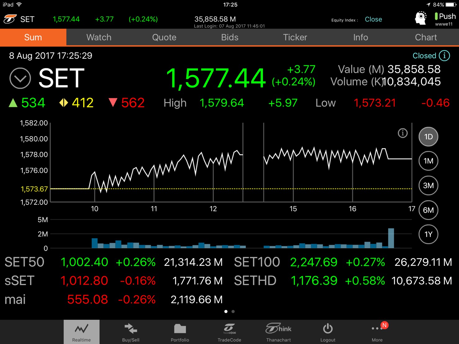 ผู้สื่อข่าวรายงานว่าดัชนีตลาดหลักทรัพย์ฯ ปิดวันนี้ที่ระดับ 1,577.44 จุด เพิ่มขึ้น 3.77 จุด (+0.24%) มูลค่าการซื้อขาย 35,858.58 ล้านบาท โดยการซื้อขายดัชนีเคลื่อนไหวแดนบวกเป็นส่วนใหญ่ ดัชนีแตะจุดสูงสุดที่ระดับ 1,579.64 จุด และต่ำสุดที่ระดับ 1,573.21 จุด