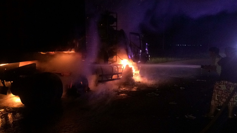 เบื้องต้นทราบว่าขณะที่รถสิบล้อจะนำขี้เลื่อยไปส่งที่อำเภอวังน้อย จ.พระนครศรีอยุธยา แล่นออกจากด่านชั่งน้ำหนัก และชะลอรถเพื่อเบี่ยงเข้าขอบทางแวะจอดพัก ปรากฏว่ารถพ่วงคอนเทนเนอร์บรรทุกสับปะรดกระป๋องมาเต็มคันแล่นตามหลังได้ชนท้ายอย่างแรงจนเกิดเพลิงลุกไหม้ คนขับรถพ่วงจึงรีบกระโดดออกก่อนที่เพลิงจะลุกลามทั่วส่วนหัวรถจนไหม้เกรียม คาดว่าคนขับรถพ่วงคงหลับใน ประกอบกับรถทั้งสองคันเป็นรถบรรทุกน้ำหนักมาก ทำให้เกิดแรงส่งชนกันเต็มแรง ซึ่งเจ้าหน้าที่จะสอบปากคำคนขับรถทั้งสองคันอีกครั้ง ก่อนดำเนินการตามกฎหมาย.-สำนักข่าวไทย
