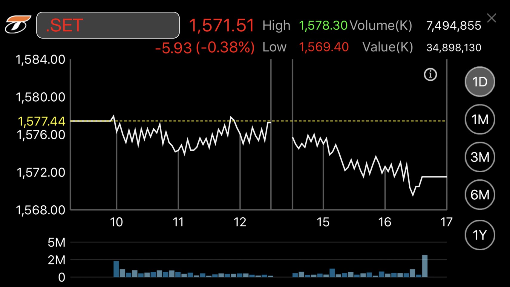 ผู้สื่อข่าวรายงานว่าดัชนีตลาดหลักทรัพย์ปิดวันนี้ที่ระดับ 1,571.51 จุด ลดลง 5.93 จุด หรือร้อยละ 0.38 มูลค่าการซื้อขาย 34,898.13 ล้านบาท โดยการซื้อขายดัชนีเคลื่อนไหวแดนลบเป็นส่วนใหญ่ ดัชนีแตะจุดสูงสุดที่ระดับ 1,578.30 จุด และต่ำสุดที่ระดับ 1,569.40 จุด