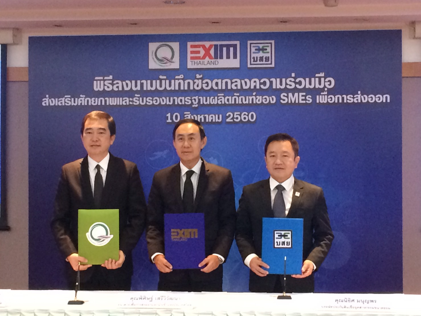 นายพิศิษฐ์ เสรีวิวัฒนา กรรมการผู้จัดการ ธนาคารเพื่อการส่งออกและนำเข้าแห่งประเทศไทย (EXIM BANK) นายนิธิศ มนุญพร กรรมการและผู้จัดการทั่วไป บรรษัทประกันสินเชื่ออุตสาหกรรม ขนาดย่อม (บสย.) และนายสุรชัย กำพลานนท์วัฒน์ กรรมการผู้อำนวยการ บริษัท ห้องปฏิบัติการกลาง (ประเทศไทย) จำกัด (CLT) หรือเซ็นทรัลแล็บไทย ร่วมลงนามในบันทึกข้อตกลงความร่วมมื อ (MOU) ส่งเสริมศักยภาพและรับรองมาตรฐานผลิตภัณฑ์ของ SMEs เพื่อการส่งออก มุ่งเน้นสนับสนุนทางการเงินทุนควบคู่กับการยกระดับมาตรฐานสินค้าแบรนด์ไทย โดยเฉพาะสินค้าเกษตร อาหาร และเครื่องสำอาง นำบุกตลาดส่งออกในตลาดต่างประเทศ