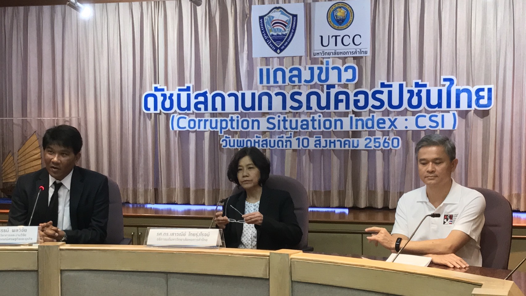 นางเสาวณีย์ ไทยรุ่งโรจน์ อธิการบดี มหาวิทยาลัยหอการค้าไทย แถลงดัชนีสถานการณ์คอรัปชันไทย (Corruption Situation Index : CSI) แถลงผลสำรวจดัชนีสถานการณ์คอร์รัปชันไทย ว่า สถานการณ์คอรัปชัน ยังอยู่ในเกณฑ์ดีมาก พบว่าผู้เกี่ยวข้องไม่จ่ายเงินใต้โต๊ะ ดีที่สุดในรอบ 8 ปี อย่างไรก็ตาม คนไทยมีความห่วงใยต่อสถานการณ์คอรัปชันในอนาคต จะมีความรุนแรงมากขึ้นจากการที่ภาครัฐจะมีโครงการกระตุ้นเศรษฐกิจในส่วนภูมิภาค และการเดินหน้าโครงการลงทุนขนาดใหญ่ภาครัฐ ทั้งโครงสร้างพื้นฐาน และโครงการในพื้นที่ระเบียงเศรษฐกิจพิเศษภาคตะวันออกหรืออีอีซี ขณะที่ผู้ที่เกี่ยวข้องกับโครงการลงทุนภาครัฐ เริ่มเห็นช่องทางในการคอรัปชันมากขึ้น และตอนนี้เริ่มมีการรับเงินใต้โต๊ะมีมากขึ้น โดยมีการจ่ายเงินสูงกว่าร้อยละ 25 มากขึ้นและมีการจ่ายสูงสุดร้อยละ 35 ของมูลค่าโครงการ