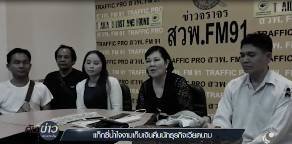 นางสาวจิตต์ผ่องใส ศรีวังพล ผู้จัดการสถานีวิทยุ สวพ.FM 91 กล่าวว่า ภายหลังจากรับกระเป๋าพร้อมทรัพย์สินมีค่า ที่นายชาติ จันทา นำมาฝากแล้ว ทีมงานได้โทรศัพท์ไปยังโรงแรมหลายแห่ง ภายในซอยเพชรบุรี 15 เพื่อขอความร่วมมือตรวจเช็กรายชื่อลูกค้า ที่เข้าพักในโรงแรม กระทั่งพบว่า VU THI KIM PHUONG นักธุรกิจชาวเวียดนาม พักอาศัยอยู่ที่โรงแรม เจ ทู เอส เดินทางเข้าไปแจ้งความลงบันทึกประจำวันไว้กับ พนักงานสอบสวน สภ.คูคต เมื่อเวลา 15.30 น. ว่า ใช้บริการรถแท็กซี่ สีชมพู จำหมายเลขทะเบียนไม่ได้ ขึ้นรถจาก ประตูน้ำ ไปลงรถที่ ร้านมนัสชนก เทรดดิ้ง ตลาดสี่มุมเมือง ต.คูคต อ.ลำลูกกา จ.ปทุมธานี และได้ลืมกระเป๋า ภายในประกอบด้วยทรัพย์สิน หนังสือเดินทาง พาสปอร์ต เงินสด 4,100 ดอลลาร์สหรัฐ โทรศัพท์ ซุมซุง เอส 7 จำนวน 1 เครื่อง และไอโฟน 6 จำนวน 1 เครื่อง จึงได้ประสานงาน VU THI KIM PHUONG ผ่านล่ามแปลพานักธุรกิจชาวเวียดนาม เข้ามารับทรัพย์สินมีค่าคืน