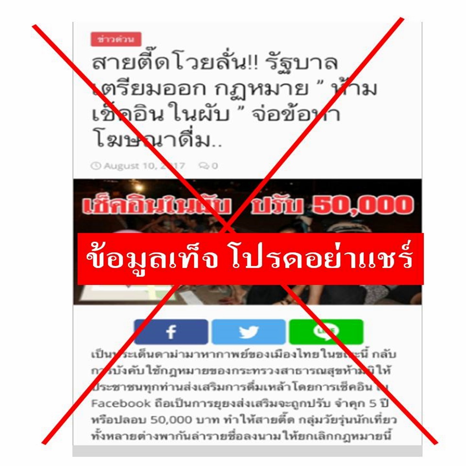 นายแพทย์นิพนธ์ ชินานนท์เวช ผู้อำนวยการสำนักงานคณะกรรมการควบคุมเครื่องดื่มแอลกอฮอล์ กรมควบคุมโรค กระทรวงสาธารณสุข ให้สัมภาษณ์ ว่า ตามที่มีการแชร์ข้อมูลในสื่อสังคมออนไลน์ ในประเด็น “การบังคับใช้กฎหมายของกระทรวงสาธารณสุข ที่ห้ามมิให้ประชาชนทุกท่านส่งเสริมการดื่มเครื่องดื่มแอลกอฮอล์ โดยระบุว่าหากประชาชนเช็คอิน ทางเฟสบุ๊ค(Facebook)ในสถานบันเทิงจะถือเป็นการยุยงส่งเสริม และต้องได้รับโทษจำคุก 5 ปี หรือปรับ 50,000 บาท ” นั้น ขอชี้แจงว่า ข้อมูลดังกล่าวเป็นเท็จ เนื่องจากรัฐบาล กระทรวงสาธารณสุขและรัฐมนตรีว่าการกระทรวงสาธารณสุข ไม่ได้มีนโยบายหรือข้อสั่งการในเรื่องดังกล่าว และตาม พ.ร.บ.ควบคุมเครื่องดื่มแอลกอฮอล์ พ.ศ. 2551 ไม่ได้ระบุว่าการเช็คอินในสถานบันเทิงเป็นการยุยงส่งเสริมการดื่มเครื่องดื่มแอลกอฮอล์