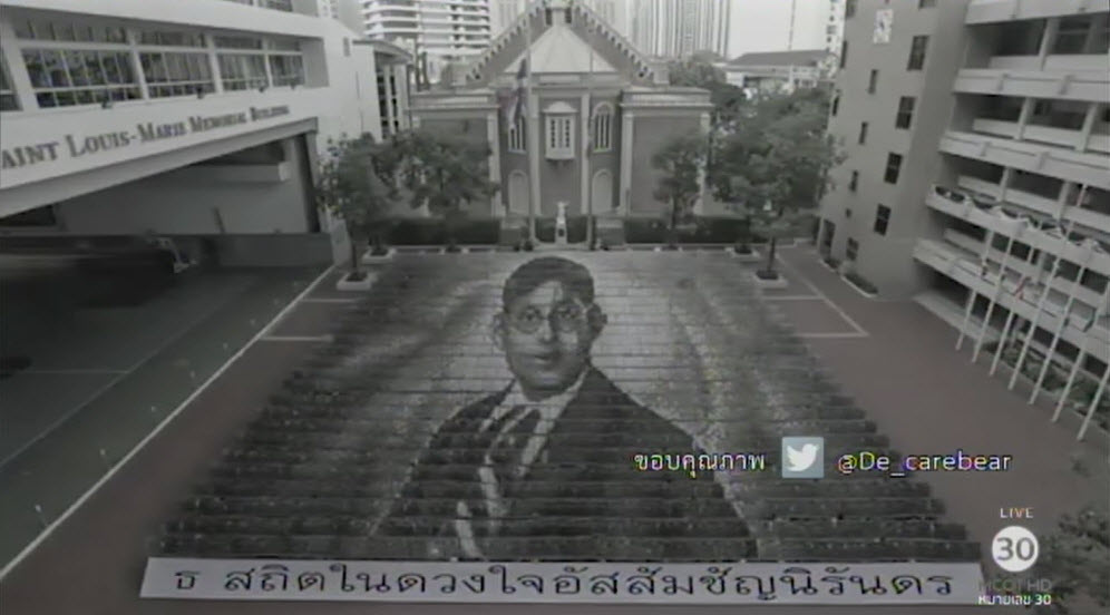 ผู้ใช้ทวิตเตอร์ @Dr_carebear โพสต์คลิปวิดีโอนักเรียนโรงเรียนอัสสัมชัญ จำนวน 1,250 คน แปรอักษรแสดงความอาลัยแด่พระบาทสมเด็จพระปรมินทรมหาภูมิพลอดุลยเดช โดยเป็นภาพพระบรมสาทิสลักษณ์หลายต่อหลายภาพผลัดเปลี่ยนไปเรื่อยๆ งดงามและน่าทึ่งเหมือนสร้างด้วยคอมพิวเตอร์กราฟฟิก แต่แท้ที่จริงภาพสวยงามทั้งหมดนี้มาจากสองมือและหัวใจของนักเรียนทุกคน พร้อมข้อความ “ธ สถิตในดวงใจอัสสัมชัญนิรันดร์”.-สำนักข่าวไทย