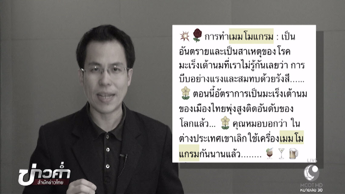 สำนักข่าวไทย 26 ต.ค.-สังคมออนไลน์มีการแชร์ว่า แมมโมแกรมทำให้เป็นมะเร็งเต้านมเรื่องนี้จริงหรือไม่ รวมถึงการกระแทกและการใส่เสื้อชั้นในที่มีโครง ติดตามจากศูนย์ชัวร์ก่อนแชร์.-สำนักข่าวไทย