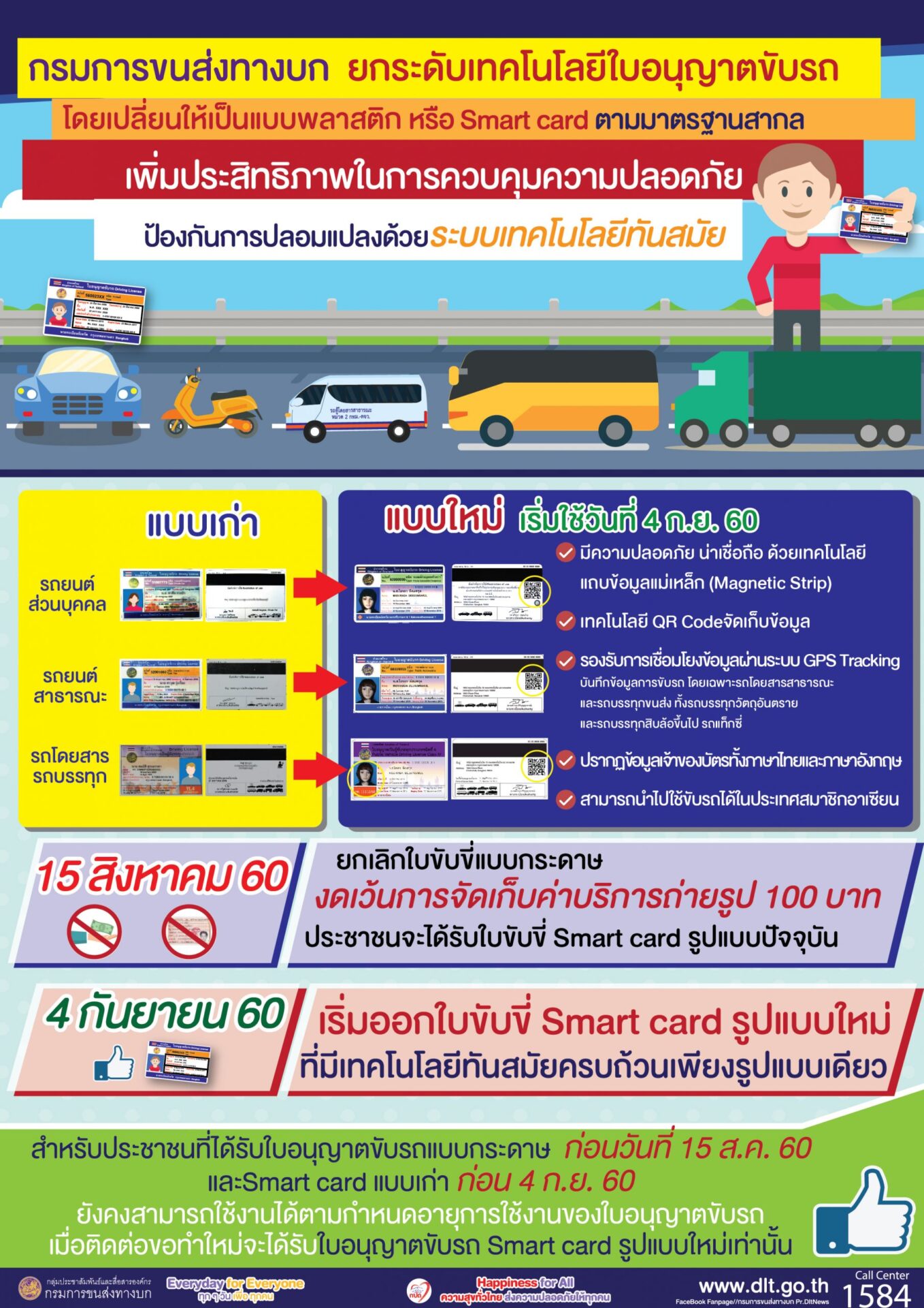 ทั้งนี้ ตั้งแต่วันที่ 4 กันยายน 2560 เป็นต้นไป กรมการขนส่งทางบกจะเริ่มออกใบอนุญาตขับรถ Smart card รูปแบบใหม่ที่มีเทคโนโลยี QR Code ให้แก่ผู้ขอรับใบอนุญาตขับรถทั้งตามกฎหมายว่าด้วยรถยนต์และกฎหมายว่าด้วยการขนส่งทางบกเพียงรูปแบบเดียว เพื่อประโยชน์ในการควบคุมกำกับดูแลความปลอดภัยของประชาชนผู้ใช้รถใช้ถนนอย่างมีประสิทธิภาพและมาตรฐานเดียวกันทั่วประเทศ สำหรับประชาชนที่ได้รับใบอนุญาตขับรถรูปแบบกระดาษที่กรมการขนส่งทางบกออกให้ก่อนวันที่ 15 สิงหาคม 2560 รวมถึงใบอนุญาตขับรถ Smart card ที่ออกให้ก่อนวันที่ 4 กันยายน 2560 ยังคงสามารถใช้งานได้ตามกำหนดอายุการใช้งานของใบอนุญาตขับรถ แต่หากชำรุด สูญหาย หรือถึงกำหนดระยะเวลาต่ออายุใบอนุญาตขับรถ เมื่อติดต่อขอทำใหม่จะได้รับใบอนุญาตขับรถ Smart card รูปแบบใหม่เท่านั้น