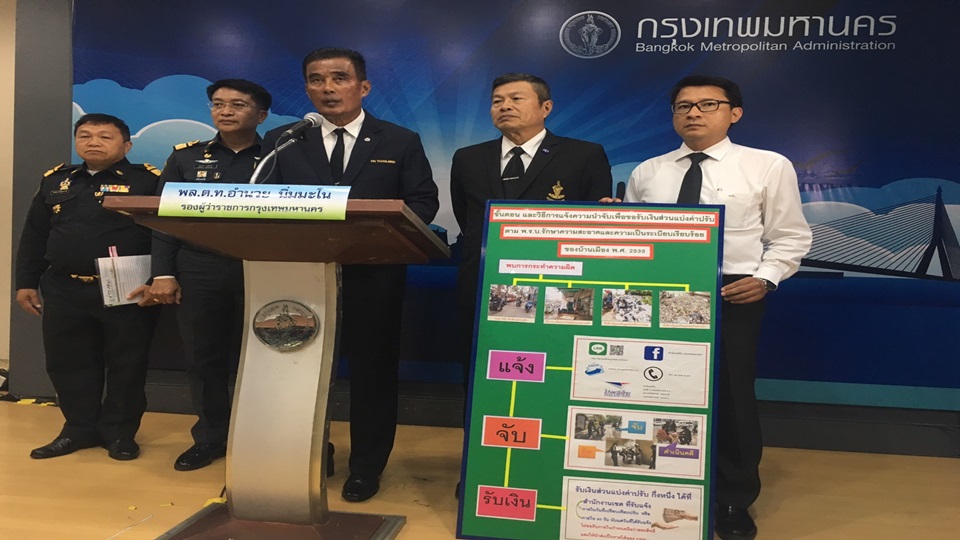 พลตำรวจโทอำนวย นิ่มมะโน รองผู้ว่าราชการกรุงเทพมหานคร เปิดเผยถึงการให้รางวัลนำจับกึ่งหนึ่งของค่าปรับแก่ผู้แจ้ง หรือครึ่งหนึ่ง กรณีพบเห็นผู้กระทำผิด พ.ร.บ.รักษาความสะอาดและความเป็นระเบียบเรียบร้อยของบ้านเมือง พ.ศ.2535 ว่า พลตำรวจเอก อัศวิน ขวัญเมือง ผู้ว่าราชการกรุงเทพมหานคร ได้ลงนามในระเบียบกรุงเทพมหานคร ว่าด้วยหลักเกณฑ์ วิธีการ และเงื่อนไขการแบ่งค่าปรับที่ได้จากการเปรียบเทียบให้แก่ผู้แจ้งความนำจับตามกฎหมาย ว่า ด้วยการรักษาความสะอาดและความเป็นระเบียบเรียบร้อยของบ้านเมือง พ.ศ.2560เมื่อวันที่ 20 ก.ค.ที่ผ่านมา ซึ่งระเบียบดังกล่าวจะครอบคลุมถึงการขับขี่รถจักรยานยนต์บนทางเท้า ทิ้งขยะในคูคลอง ทิ้งขยะในที่สาธารณะ การฝ่าฝืนตั้งหาบเร่-แผงลอย รวมถึงการติดป้ายประกาศตามเสาไฟ ซึ่งอัตราค่าปรับสูงสุด 10,000 บาท หากประชาชนพบเห็นการกระทำผิดดังกล่าวสามารถแจ้งต่อเจ้าหน้าที่ได้ทันที ผ่านทางช่องทางต่างๆ อาทิ โทรศัพท์สายด่วนกทม. 1555 ไปรษณีย์ โทรสาร และอีเมลล์ โดยต้องมีหลักฐานอาทิ ภาพถ่าย หรือวิดีโอที่แสดงถึงการกระทำผิดที่ชัดเจนประกอบด้วย โดยเรียกหัวหน้าฝ่ายเทศกิจทั้ง 50เขตมาชี้แจง ขั้นตอน เพื่อให้ดำเนินงานเป็นไปในทิศทางเดียวกัน