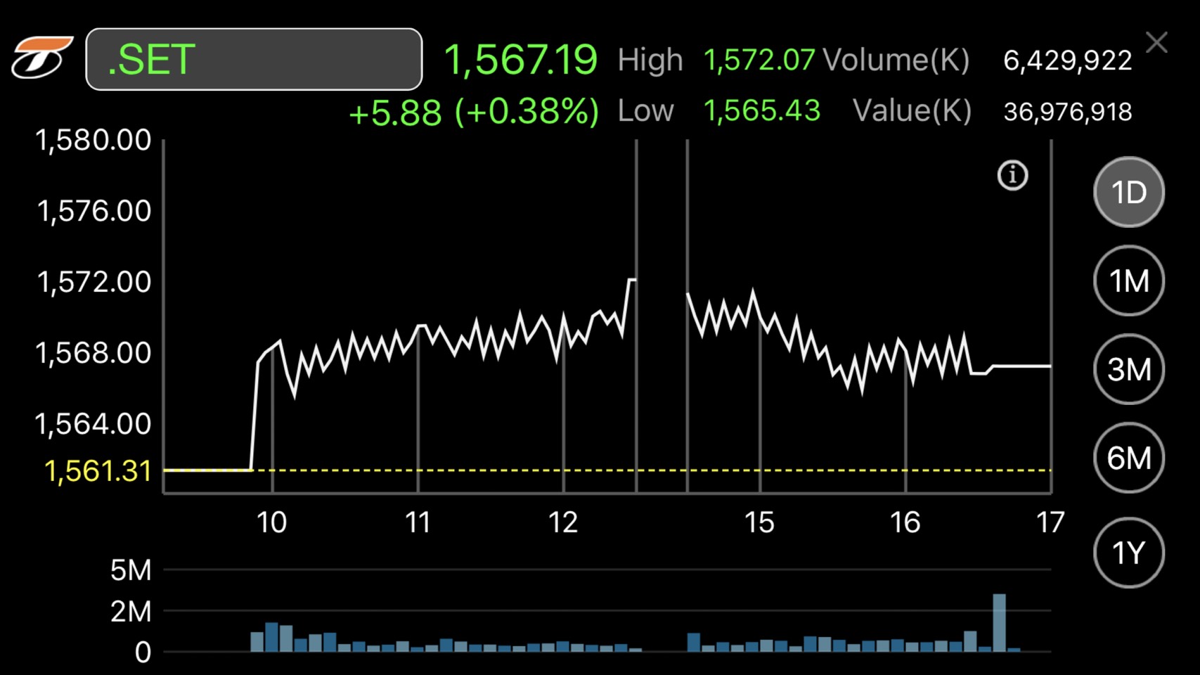 ผู้สื่อข่าวรายงานว่าดัชนีตลาดหลักทรัพย์ฯ ปิดวันนี้ที่ระดับ 1,567.19 จุด เพิ่มขึ้น 5.88 จุด หรือร้อยละ 0.38 มูลค่าการซื้อขาย 36,976.92 ล้านบาท โดยการซื้อขายดัชนีเคลื่อนไหวแดนบวกตลอดทั้งวัน แตะจุดสูงสุดที่ ระดับ 1,572.07 จุด และต่ำสุดที่ระดับ 1,565.43 จุด